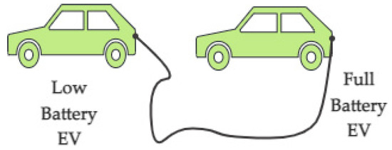 V2V operation facilitates charge transfer among EVs, as shown in Figure 8. This concept allows vehicle owners to share their battery charge with other vehicle owners [23,24].