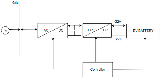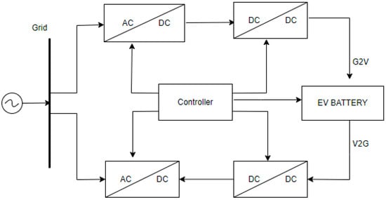 This bidirectional unit can be made using two unidirectional converters or with a single bidirectional converter, as illustrated in Figure 12 and Figure 13 [59]. Unidirectional converters result in more cost and weight concerns; hence, in V2G systems, bidirectional converters are now preferred. In [60], the author explains high-voltage-800V DC link voltage systems, which are in development, for EVs. Compared with 400V systems, these offer savings in charging time, a reduction in weight, and increased efficiency. Higher initial development costs are a disadvantage; however, over the long term, this can be reduced. J. Wang et al., in [61], review several isolated and non-isolated BDC topologies for EV. The need for a reliable BDC with an improved voltage conversion ratio for high-voltage EV systems is also discussed.