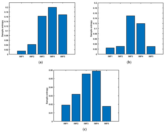 A group of acquired braking signals can be extracted via the VMD decomposition of the effective components to obtain five groups of IMF component signals that are not in the center frequency, and then, the sample entropy for each group of IMF signals can be solved to complete the feature extraction of a group of braking signals. Figure 3 shows the sample entropy of the IMF components of the three braking intention signals.