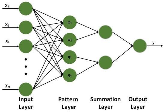 The input layer of the model is responsible for passing feature vectors into the network with the same number of neurons as the sample dimensions. The pattern layer is the middle link between the input layer and the summation layer, using the Gaussian function as the activation function, calculating the similarity between the input feature vectors and each pattern in the training set, and feeding its distance into the Gaussian function to obtain the output of the pattern layer. The similarity is calculated as shown in Equation (13).