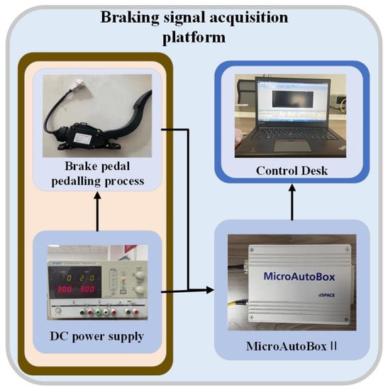 This paper divides braking intentions into three categories: deceleration braking, parking braking, and emergency braking [27]. Deceleration braking indicates braking for the purpose of slowing down and usually occurs on speed-limited roads. Stopping braking is braking for the purpose of stopping and often occurs at red lights or junctions. Emergency braking is the act of stopping a vehicle in an emergency situation. The brake signal acquisition platform built on the basis of the dSPACE semi-physical simulator is shown in Figure 6, which enables the acquisition of brake signals with different braking intentions in real life. The platform consists of an electronic brake pedal, a dSPACE MicroAutoBox, a host PC, and a DC-regulated power supply. Micautobox is a semi-physical simulator produced by dSPCE, Germany, which allows the study of rapid control prototypes and hardware-in-the-loop simulation. The DC-regulated power supply provides 24 V and 12 V to the MicroAutoBox and the electronic brake pedal, respectively. The electronic brake pedal is the braking signal emitting a voltage signal of 0–4.85 V to characterize the brake pedal travel as the braking action is applied. dSPACE MicroAutoBox is responsible for the real-time transfer of the braking signal to the host PC for data storage and analysis.