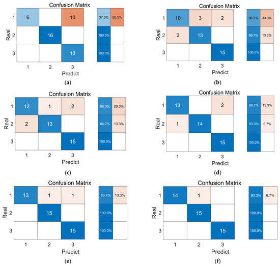 Recognition results of different algorithms. (a) Random Forest; (b) BP; (c) SVM; (d) PNN; (e) GA-PNN; (f) SSA-PNN.