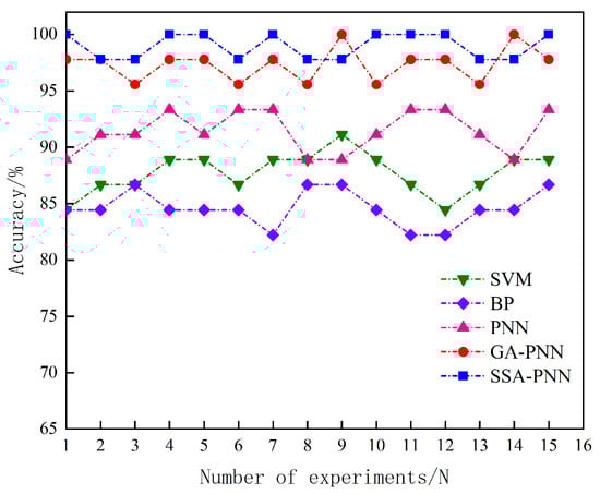To rule out chance and further validate the advantages of SSA-PNN, 15 sets of validation were performed, and the identification results are shown in Figure 8.