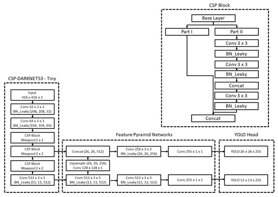 Tiny-YOLO v4 was implemented in this study to minimise the computational and memory demands of the model. The architecture of this model is presented in Figure 4. Table 1 shows details of the Tiny-YOLO v4 architecture and how it compares to the traditional YOLO architecture.