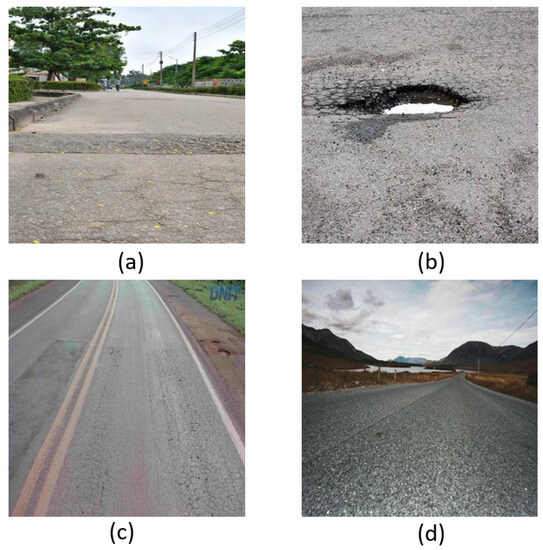 Given the scarcity of online benchmark road anomaly datasets and the limited publicly available datasets for pothole identification [43], 576 images of road anomalies were obtained manually from primary and secondary sources. The primary data sources were locations around Federal University of Technology Minna campus and contained potholes, cracks, lanes, and speed bumps. Additionally, the secondary data source included images obtained online containing the desired road anomalies. In addition, negative samples, which are road images containing no anomalies, were used to improve the detection performance of the system. The variability in the data orientation would make the model robust and invariant to scale as they reflect real-world scenarios that object detection models will encounter, leading to more robust and generalisable models [44,45]. Table 2 shows a decomposition of the data classes obtained with their corresponding number of instances. Figure 5 shows examples of the images used in the study.