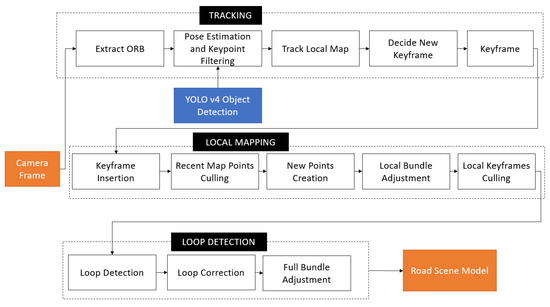 The modified V-SLAM technique developed is called RA-SLAM (Road Anomaly SLAM). This technique was built based on ORB-SLAM, which is an open source visual SLAM technique that is suitable for monocular, stereo, and RGB-D cameras [48]. This choice of process is based on its high accuracy and precision [18]. ORB-SLAM comprises three primary elements: Tracking, Local Mapping, and Loop Closure. Within the Tracking phase, the system locates the camera, pulls out key points, and decides when to introduce a fresh keyframe, all by leveraging ORB features from the captured images. The Local Mapping phase employs these keyframes to recreate the environment around the camera’s position. The Loop Closure phase, meanwhile, scouts for loops within the keyframes to refine the resulting map. These ORB-SLAM stages focus specifically on tracking, creating maps, and identifying loops. To incorporate object detection into this framework, this research turned to deep learning methods. This integration with the V-SLAM technique is presented in Figure 6.