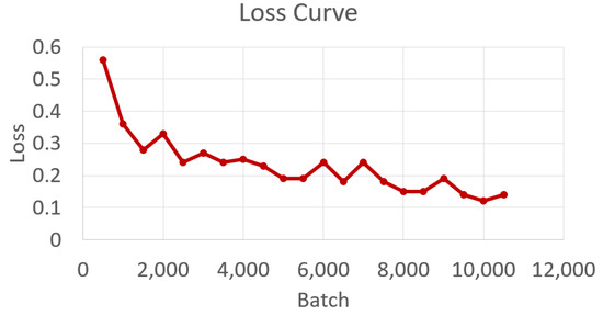 The training process for the road surface characterisation model concluded after 3.6 h. Figure 7 and Figure 8 show the performance of model based the loss function (Equation (11)) and the mAP@0.5 (Equation (9)). The curves were obtained by plotting the loss value and mAP@0.5 against the batch processed. The plots highlight the learning ability of the model as it learns incrementally from the training dataset. It can be observed from the figures that as the number of batches processed increases, the loss value reduces while the mAP@0.5 increases. It can be observed from the figures that the training loss reduces from 0.56 at batch 500 to 0.14 at batch 10,500. On the other hand, the mAP@0.5 increases from 0% at batch 500 to 95.34% a batch 10,500.