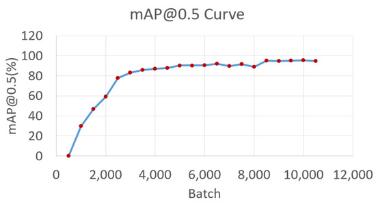 The parameter AP represents the area under the precision–recall (PR) curve, which is a plot showing precision as a function of recall. The mAP is the average of all classes’ AP scores. The AP and mAP are shown in Equations (8) and (9), respectively [47].