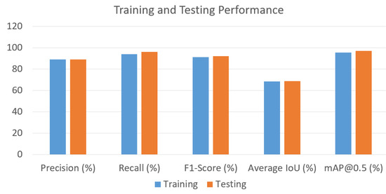 The overall performance of the model during training and testing was evaluated and compared. The results of this performance are presented in Figure 9. The figure shows a comparison in terms of the precision, recall, F1-score, average IoU, and mAP@0.5. The figure highlights the performance of the model during training, where the model learns, as compared to during testing, where the model has learned. On one hand, the training performance exhibited a precision of 89%, a recall of 94%, an F1-score of 91%, an average IoU of 68.47%, and a mAP of 95.34%. On the other hand, the testing performance exhibited a precision of 89%, a recall of 96%, an F1-score of 92%, an average IoU of 68.72%, and a mAP of 97%. It can be observed from the figure that the testing performance of the model was slightly better than the training performance in all the metrics considered. This low difference between the performances also indicates that the model did not over-fit.
