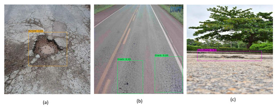 Qualitative performance evaluation: (a) detected pothole, (b) detected cracks, (c) detected speed bumps.