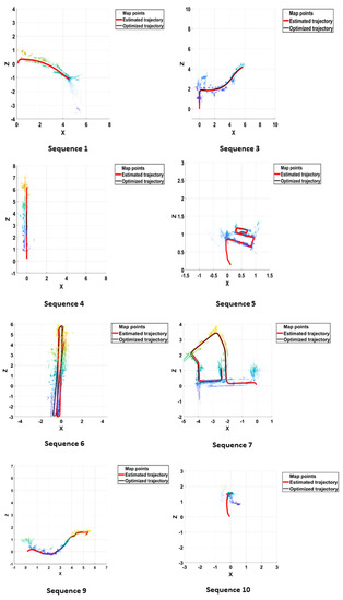 The performance evaluation of the RA-SLAM algorithm was carried out using the root mean square error (RMSE) and mean absolute error (MAE) between the estimated and ground truth trajectories. The RA-SLAM algorithm was implemented in MATLAB on a computer with an Intel core i7 processor operating at a clock speed of 2.2 GHz. The system had 8 GB of RAM and an NVIDIA GeForce GTX GPU with a size of 8GB, which was utilised for accelerating computations in the algorithm. The modified V-SLAM technique was tested on the KITTI odometry benchmark dataset, which consists of stereo sequences recorded from a car driving in an urban environment. The KITTI dataset is a widely used benchmark in computer vision and robotics research, providing a large-scale dataset for various tasks such as object detection, 3D object detection, stereo, optical flow, and more. The dataset provides ground truth poses and 3D point clouds for evaluation of the SLAM algorithm. Specifically, eight sequences of the dataset were used for evaluation. The modified V-SLAM technique was tested on eight sequences of the KITTI odometry benchmark dataset. The technique (RA-SLAM) was compared to the conventional ORB-SLAM, both of which were implemented in the same environment. The generated map for the sequences is presented in Figure 11.