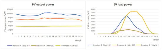 According to the journal Meteorology published by the National Meteorological Center, with the continuous westward extension and strengthening of the subtropical high, under the influence of factors such as atmospheric clear sky radiation and sinking warming, a total of two high-temperature weather processes occurred in July 2022 across the country. The first stage was 5–17 days; in the second stage, from 21 to 31 days, some areas in Jiangsu, Shanghai, Zhejiang, Fujian, Jiangxi, Anhui, southern Henan, and southern Xinjiang Basin experienced high-temperature weather of more than 40 °C. The daily maximum gas temperature approached or broke through the historical extreme value of the same period. At this stage, the high-temperature weather included several provinces. Taking one day as the time scale, we selected the PV and EV data of Jiangsu Province (denoted as province A) and Xinjiang Province (denoted as province B), which were in the same high-temperature weather (namely, 26 July), for comparison. In addition, the PV and EV data of Jiangsu Province (denoted as province A) under normal weather (that is, 26 May) were selected as controls. Line charts are drawn of the time dimension and space dimension on the influence of extreme high-temperature weather on PV and EV, as shown in Figure 2. The three curves in the two graphs in Figure 2 compare the data of different provinces in the same month under extreme heat weather and the data of different weather conditions in different months in the same province. The left plot represents EV data, and the right plot represents PV data. It can be seen that (1) compared with normal weather conditions, under the influence of extreme high-temperature weather, the light intensity is enhanced, and the PV output of province A is increased compared with the PV output of normal weather in the province, and the electricity load data is also increased in the extreme high-temperature weather. (2) Under the same extreme high-temperature weather condition, the dimension of province B is lower than that of province A, and the light is stronger under the same temperature condition, so the PV output data are higher. Compared with province B, province A is more developed in population and economy, and has a higher penetration rate of electric vehicles. Therefore, under the same weather conditions, province A has a greater demand for electricity load.