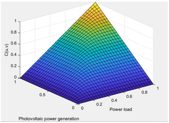 Firstly, the copula force correlation model is established by using the historical force data at all times to illustrate the process of copula model establishment. The edge distribution function of PV and EV powers under extreme hot weather in this province is estimated using non-parametric kernel density. Then, four kinds of copula functions are constructed; unknown functions in copula functions are obtained through parameter estimation. Different copula functions are selected to combine the edge distribution functions of PV and EV, and the optimal copula function is selected according to Section 3.1.3. The Kendall rank correlation coefficient, Spearman rank correlation coefficient and squared Euclidean distance of each copula function are shown in Table 2. Table 2 reveals that the correlation coefficients calculated using the Frank copula method closely approximate those obtained from the sample data. Moreover, the Euclidean distance between the Frank copula and empirical copula is the smallest among all the results. Finally, we can obtain the joint probability distribution of PV and EV under extreme high-temperature weather, as shown in Figure 3.