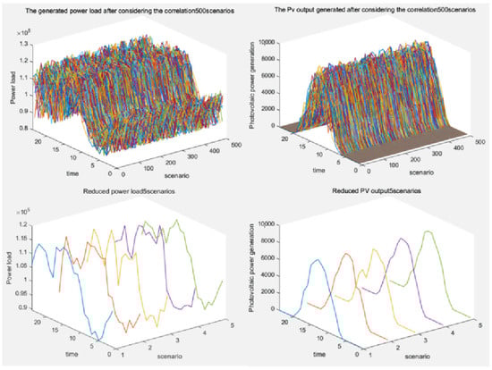 The copula model at 24 moments is sampled according to probability, and the power output scenes at 24 moments are spliced into the joint power output scenes of complete moments, which are reduced using the k-means clustering algorithm. In order to consider the difference of the PV and EV time-series distribution function, the typical joint power output scenes of the PV and EV time series are shown in Figure 4. The two color graphs in the top half of Figure 4 show the power corresponding to the changes over time of 500 scenes generated by PV and EV, respectively. The two line charts composed of green, purple, yellow, red, and blue in the bottom half of Figure 4 show the corresponding PV and EV power, respectively, generated by the clustering method over time after the scenes are reduced to five scenes. As can be seen from the two line graphs in the lower part of Figure 4, the variation in PV output with time and the variation in EV load power with time are similar under extreme high-temperature weather. The curve of PV output with time is parabolic, reaching the maximum value at noon of a day, that is, when the light is the strongest, which is in line with reality. The curve of electric vehicle load with time is relatively tortuous, and the electricity load reaches its highest value in the afternoon and evening.