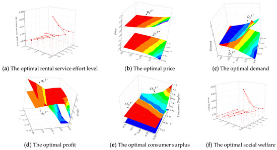 Figure 2a depicts the impact of leasing service effort coefficient α and leasing service effort marginal cost β on the optimal rental service effort level. The optimal leasing service effort level increases with the increase in leasing service effort coefficient and decreases with the leasing service effort marginal cost. In general, the optimal rental service effort level is increasing under the two factors of α and β. When the leasing service effort coefficient α = 0.4 and the marginal cost of rental service effort β = 0.5, the leasing service effort level provided by m2 reaches the maximum. At this time, consumers can better obtain services such as post-rent battery upgrades, vehicle health management inspections and consumers’ on-demand use of flexible battery swaps provided by m2.