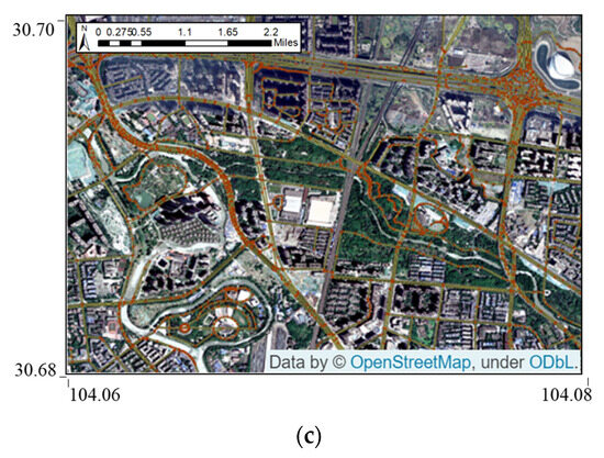 Trajectory data: This study utilized Chengdu taxi trajectory data from Didi Gaiya, specifically from October 2018 and August 2014. The dataset includes attributes such as driver ID, order ID, timestamp, longitudes, and latitudes. Despite covering trajectory data for a single month, the dataset comprises over 380,000 trajectories generated by 14,000 vehicles. Notably, 270,000 trajectories are generated on holidays, while 110,000 pertain to working days. In terms of data distribution, the dataset predominantly covers the urban area of Chengdu, spanning from 30.65283 to 30.72649° N and 104.04210 to 104.12907° E. Each trajectory in the dataset has a sampling frequency of 4 s, resulting in a relatively high data density on the city road network. Given the dataset’s substantial volume, comprehensive distribution, and frequent sampling, it provides sufficient data to effectively train the proposed model presented in this paper.