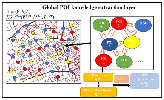 A global traffic knowledge graph was constructed to learn and represent POI semantic information. POI nodes were considered as the entity, and the connection between POI was considered as the relationship. The representation vector of each node was obtained by using the Translate Embedding (TransE) algorithm and was considered as the feature vector for vehicle location prediction.