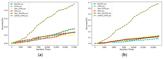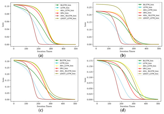 Figure 8a,b, the loss of LDGST-LSTM drops slowly compared with the benchmark models before the 200th iteration on the dataset of October 2018. The convergence speed of the proposed model becomes faster from the 250th to the 300th iterations, and it converges at around the 350th iteration. As shown in
