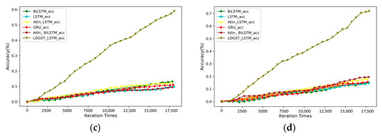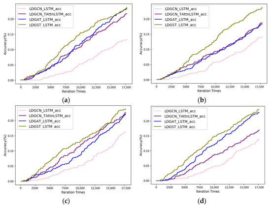 Figure 8c,d, the loss of LDGST-LSTM drops slowly compared with the benchmark models before the 200th iterations on the dataset of August 2014. Additionally, the convergence speed of the proposed model becomes faster from the 250th to the 350th iterations and it converges at around the 450th iteration.
