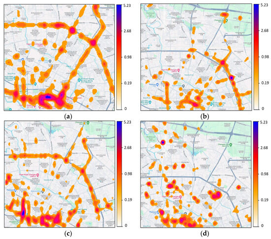 Figure 10b,d. It can be seen that on holidays and weekends, POI in the western and southern regions can be considered important information that influences vehicle trajectories. It may denote that these regions are close to the center of the city and have high traffic flow on holidays and weekends. Therefore, it is important to plan the driving path in these regions on holidays and weekends. Moreover, POI regions that influence the location prediction are more dispersed on working days, and the trajectory decision can be more flexible.