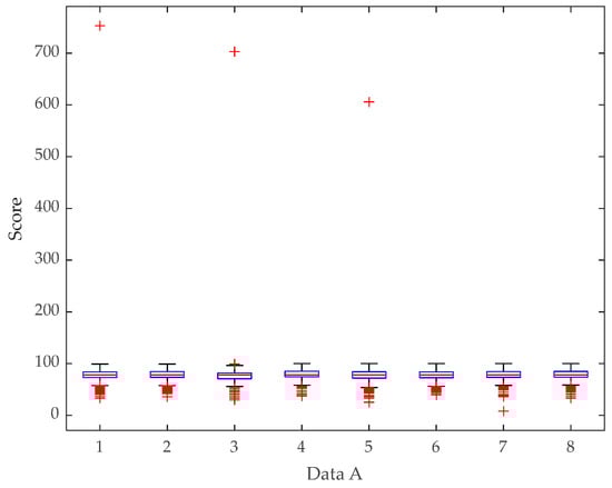 Data A filtered by the box plot method. Red "+" in the figure represents the satisfaction scores in data A.