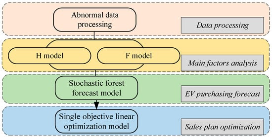 After the customer data processing is completed, the influencing factors of the EV purchase are analyzed to determine the important influencing factors. Then, based on the important factors, the probability prediction model of the customer’s EV purchase is established. Finally, the sales plan optimization model is established. The flow chart of these models is shown in Figure 2.
