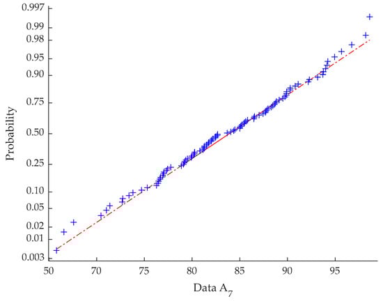 Data group 25 normal distribution probability graph. Blue "+" in the figure represent the probability of values in data A7. The dotted red line reflects the degree to which the data conform to a normal distribution.