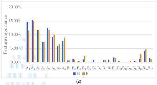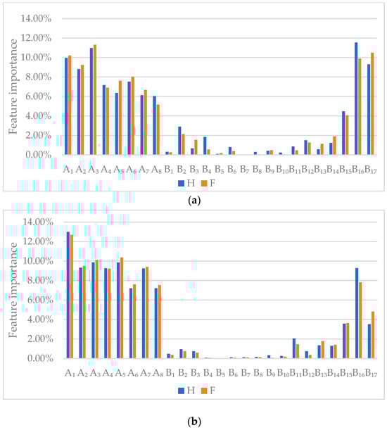 As shown in Figure 5, the analysis results of the influencing factors of the F and H models are basically consistent and mutually verified. Overall, for the three brands, data A has a greater influence, while data B has a lesser influence, which means that customer experience score has a great influence on EV purchase. In addition, B5, B7, and B8 (family size, number of children, and year of birth) have little impact. However, there are certain differences in the influence factors of different brands, among which B16 and B17 have a greater influence on the purchase of Brand 1 and Brand 2, and a relatively small influence on Brand 3. For further analysis, based on the results of the F model with 4% as the benchmark, the main influencing factors are screened out according to the proportion shown in Table 4.