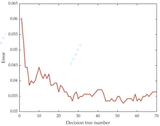 Although the total number of samples in S* is equal to the total number of samples in S, S* may contain duplicate samples. When duplicate samples are removed, S* contains only about 63.2% of the samples in S. Then, using the exhaustive method [37], all values of each feature in the sample are traversed to find the best segmentation variable and segmentation point. The quality of the segmentation variables and segmentation points is measured by the impurity of the nodes after segmentation, which is the weighted sum G(ro, tcd) of the impurity of the child node: