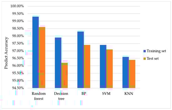 In order to further verify the random forest purchase prediction model, this paper simultaneously compares the decision tree prediction model, the BP neural network prediction model, the SVM prediction model, and the KNN prediction model. Take Brand 1 as the research object; the comparison of model results is shown in Figure 7. As shown in the figure, the random forest prediction model has the highest accuracy compared to the other models.