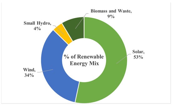 The 21st century witnesses a notable surge in global energy demand, driven by economic advancement and population growth. In India, the energy generation landscape mostly relies on fossil fuels, with coal comprising 49.1%, natural gas 6%, nuclear 1.6%, and diesel 0.1%, while renewable energy sources make up 41.6%, as depicted in Figure 1 []. However, this reliance on fossil fuels is depleting the nation’s reserves of coal and natural gas rapidly as it strives to fulfil the escalating electricity needs of an increasing population and swift urbanization. Furthermore, this increasing demand for power exacerbates environmental challenges such as global warming and heightened greenhouse gas emissions. Consequently, promoting non-conventional energy sources such as wind, photovoltaic (PV), biomass, and hydroelectric power emerges as a practical solution to address the surging energy demand while mitigating greenhouse gas emissions [,,,]. Nevertheless, India boasts abundant solar and wind energy resources, as depicted in Figure 2. Beyond manufacturing, researchers are diligently pursuing advancements to harness solar energy more effectively. This includes the development of hybrid energy systems integrating various renewable sources of energy and storage technologies alongside PV panels. Various hybrid configurations have been proposed, such as PV–wind–battery [,], PV–battery–fuel cell [,], PV–wind–fuel cell [], PV–biomass [], and others. Even though many of these hybrid structures are made for stand-alone uses without connection to the electrical grid, integrating them with grid-connected systems presents a viable solution to reduce reliance on storage devices and enhance power supply reliability [,,,,]. Grid-connected renewable energy systems offer numerous advantages, such as harmonic compensation, reactive power supply, load distribution, peak power reduction, regulation of voltage and frequency, and the capability to sustain essential loads during utility disruptions.