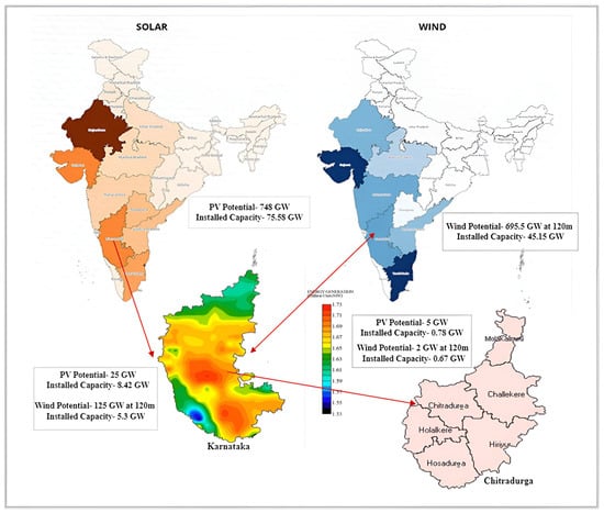 India is the world’s seventh-largest country, covering 3,287,263 square kilometers (1,269,219 square miles), and boasts abundant solar energy resources []. With solar irradiance ranging from 4 to 7 kWh/m2/day and an average of 5 kWh/m2/day, coupled with mean summer temperatures of 25–45 °C and winter temperatures of 5–25 °C, India’s tropical climate within its vast peninsula renders it rich in solar and wind power reserves. Despite this, planning and formulating policies frequently depend on governmental assessments of renewable energy potential []. Based on these estimates, the solar potential is 748.98 GW, utilizing only 3% of accessible wasteland []. In a similar vein, a prudent assessment of wind power potential at 120 m above sea level stands at 695 GW for the country []. Figure 3 depicts the chosen location, indicating its solar and wind capabilities.