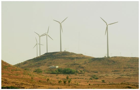 This study focuses on Chitradurga, Karnataka, India, characterized by a solar irradiance of 5.55 kWh/m2 day and a wind speed of 3.97 m/s. Positioned at 14.23°N, 76.4°E, Chitradurga sits at an average elevation of 737.9 m (2420.93 ft) above sea level, experiencing a subtropical steppe climate classified as BSh by the Köppen–Geiger system. With an annual temperature averaging 27.75 °C (81.95 °F), which is 1.78% higher than India’s average, the region maintains a temperate climate throughout the year due to its elevated position. Moreover, Chitradurga also benefits from consistent wind currents, rendering it conducive for the establishment of both photovoltaic (PV) and wind farms. Notably, the area is home to numerous solar- and wind-power plants, and its hills are adorned with windmills—a prominent feature visible upon entering the city, as depicted in Figure 4.