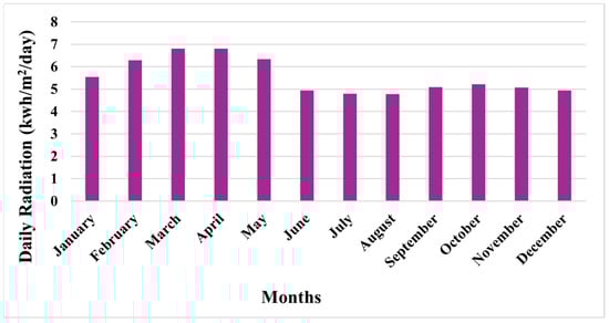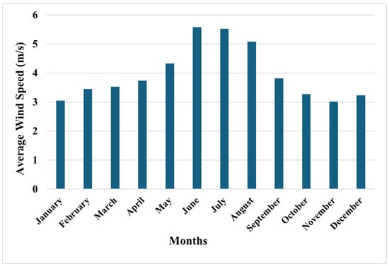 The National Renewable Energy Laboratory’s (NREL) monthly mean global radiation chart was used to evaluate the solar system’s potential capacity. Figure 5 illustrates the monthly mean solar global horizontal irradiance (GHI) for the Chitradurga district. The monthly average solar GHI stands at 5.55 kWh/m2/day, with the highest recorded in April (6.81 kWh/m2/day) and the lowest in August (4.77 kWh/m2/day). Regarding wind resources, the average monthly wind speed in the area is typically 3.39 m/s. Figure 6 presents input data for Chitradurga from January to December, depicting the wind speed for each month. Notably, June experiences the highest wind speed at 5.58 m/s, while November witnesses the lowest at 3.02 m/s.