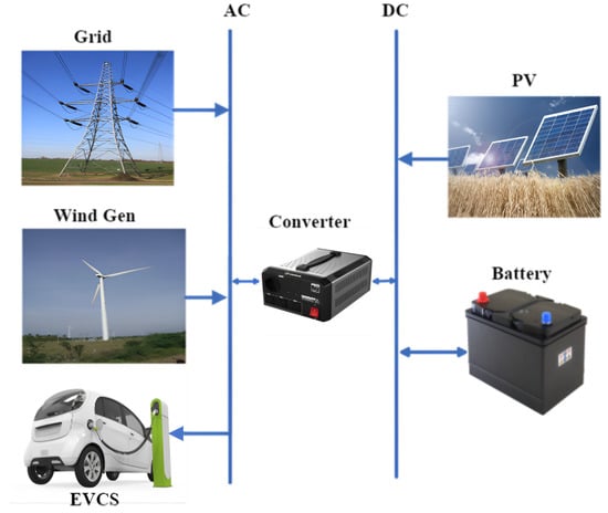 Also, the adoption of electric power in the transportation sector using renewable energy resources (RES) represents a promising and relatively novel research frontier. Utilizing RES for power generation in Electric Vehicle Charging Stations (EVCS) could lead to a substantial 433% increase in their utilization by EV users []. As Electric Vehicles (EVs) become more prevalent, accommodating their increasing numbers could be facilitated through renewable distributed generation (DG) []. The focus of numerous investigations in the literature is on Grid-to-Vehicle (G2V) connection, with emerging interest in Vehicle-to-Grid (V2G) connections due to their potential for peak power savings and the enhancement of power system reliability and efficiency [,,]. An experimental study demonstrated the feasibility of a PV–grid-connected EVCS with V2G capabilities, showing its ability to charge EVs while also contributing to grid load management with surplus electricity []. Nevertheless, optimizing the development of EVCS has been explored, considering different electricity generation alternatives including photovoltaic (PV), diesel generators, and batteries, with wind power notably absent as a choice in previous studies [,]. Residential microgrids (MGs) equipped with renewable energy sources (RESs), energy storage, and EV charging capabilities offer a key solution, as RESs help balance energy demand while addressing the issue of emissions []. The optimal system for an EV charging station powered by renewable energy in Korea was explored in []. In [], an overview of electric vehicles and their impacts, various charging modes, and different design approaches for EVCS is presented. In India, various investigations have explored the use of RES in rooftop buildings, mosques, and hospitals, primarily focusing on economic and environmental impacts [,,].