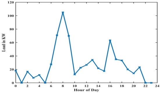 The load curve obtained from the EVCS, which is located in a typical part of Chitradurga, is depicted in Figure 7. It is noted from Figure 8 that charging primarily takes place from 6 AM to 6 PM daily, with lower activity during other hours. This results in an average yearly EV charging station operating frequency of 651 kWh/day. The EV demand pattern is nearly constant throughout the year. Therefore, the proposed PV–wind system could be a possible solution for effectively meeting the demand of 27 kW/day.