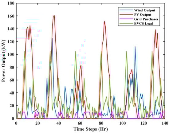 The initial step in simulating a renewable-energy-based EVCS is to design the system architecture. In this scenario, the system design includes energy sources provided by the utility, photovoltaic (PV) panels, wind turbines, batteries, converters, and the load and proposed system architecture, as depicted in Figure 7. This EVCS system’s primary aim is to consistently provide the load with the necessary power. When the grid supply is needed and the PV and wind energy are collectively unable to satisfy the load demands, the grid supply is used. Additionally, an important aspect is that the grid has the capability to purchase surplus energy generated by the PV–wind system through a sell-back policy. The cost of net exported energy is usually less than the average cost of power. According to the Indian central electricity regulatory commission (CERC), the government power tariff is 0.078 $/kWh, whereas the commercial electricity tariff is 0.10 $/kWh. For this study, the highest tariff value of $0.10/kWh is taken into consideration.