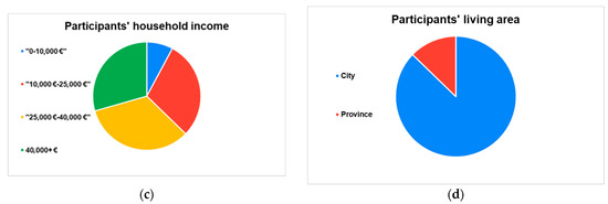 Furthermore, as can be seen in Figure 4a,b, an interesting link can be made between educational levels and the respondents’ occupations, as it appears that more than 30% have a PhD and about 50% are civil servants. This is probably due to the fact that the questionnaire was distributed through institutional emails to members of the academic community and that perhaps these percentages concern professors, researchers, and other staff. Consequently, the percentages related to the possession of a master’s degree and a bachelor’s degree are equally divided, with 30% each. As far as household income is concerned, the results (Figure 4c) are almost split between the three categories of 10,000 €–25,000 €, 25,000 €–40,000 € and over 40,000 €, with each having a percentage of about 30%. Finally, as shown in Figure 4d, only 13% appear to live in an urban environment, which indicates that the remaining 87%, who answered that they live in a province, probably live in the suburbs of the city.