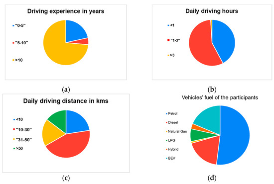 In order to create driving profiles for the participants, questions were asked concerning their driving experience in years, their daily driving hours, and corresponding mileage, as well as the type of vehicle they used, based on fuel. The driving experience of 74% of the respondents, according to the results (Figure 5a), was more than ten years; a third these were EV owners. Only 5% of the respondents had been driving between 5 to 10 years. Combined with daily driving hours (Figure 5b), almost 60% of the respondents drove between 1 and 3 h, while 45% drove 10–30 km every day (Figure 5c). Regarding the fuel used, it can be seen in Figure 5d that half of the vehicles ran on gasoline, while hybrids and electrics made up 23%, compared to those using diesel at 19%. The remaining categories, LGS and natural gas, accounted for 8%. Although the proportion of conventional vehicles is large, it is remarkable that EVs occupy almost a quarter of the fuel types used.