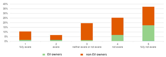 Participants’ results are shown in Figure 6. In line with what was said above, 38% were not fully aware of how EVs work, 25% were not aware, while only 11% were fully aware. What is noteworthy here is that, after separating the responses of EV owners and non-EV owners, of those who said they were not aware of how EVs operated, almost 50% had an EV. This highlights the problem of the lack of awareness related to electromobility issues and the need for proper training in the use of an EV, which includes not only the process of discharging but also that of charging the EV, with the indirect purpose of extending the battery life.