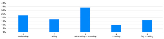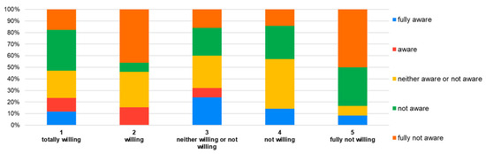The desire of those who did not own an EV to buy one in the next 5 years was then studied. Figure 7 shows that 41% showed a particular desire to buy an EV (i.e., 23% were totally willing and 18% were willing), while 33% indicated an intermediate state, translated as a lack of interest. It is important to relate these results with the awareness of EV operation in the previous question. Here, it can be seen (Figure 8) that more than 50% of those who want to buy an EV (totally willing and willing) are not aware of how it operates, while 25–30% were neither aware or not aware. Future buyers who know something about the operation of EVs accounted for 12–27%. In those who were characterized by a neutral situation, the percentage who lacked any knowledge of EVs was 40%, while for those who would not buy an EV, the corresponding percentage reached 83%. In other words, those who were familiar with EVs would buy one much more readily than those who were not aware, which was also proven in Ref. [39]. Therefore, we conclude that the lack of knowledge about the use, operation, management, and the positive and negative aspects of EVs affects drivers’ desire to invest their money in buying an EV, leaving a feeling of distrust. It is also important to note that the prevalent age group of those who already owned an EV is the 45–60 age group while future buyers are among the 35–45 and 45–60 age groups, at 30% and 23%, respectively, according to our results.