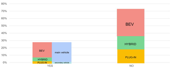 To complete the analysis on participants’ familiarity with EVs, both categories (EV owners and non-EV owners) were asked to indicate what type of EV they had, and, for those who did not, what type they would buy. Initially, as it can be seen in Figure 9, almost 27% were EV owners with BEVs accounting for 80%, hybrids 18%, and plug-ins accounting for 2%. In the same category, 93% of owners used an EV as their main commuting option. On the other hand, 73% would buy an electric vehicle in the near future, among which half would choose a BEV, 23% a plug-in, and 27% a hybrid.