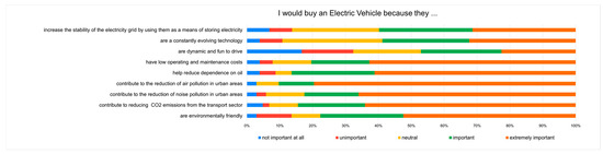 Respondents were then asked to evaluate the reasons why someone should buy an EV, by rating them based on which reason they considered extremely important or not at all important. Initially, the analysis was for the whole population of respondents. Figure 10 shows that the public’s priority is the protection of the environment, with 80% considering the contribution of EVs in reducing air pollution in urban environments as extremely important. Also of the utmost importance for more than 65% of the respondents was the reduction in noise pollution in urban environments and that of CO2 in the transport sector, underscoring the strong public sentiment that cleaner transportation, particularly electric vehicles, are key to improving air quality in urban areas [40,41]. The low operating and maintenance cost was also considered an extremely important reason for purchasing an EV for 63% of respondents. Contrary to the previous results, technological issues, and the feeling of driving an EV were considered to be extremely important reasons for almost 30% of drivers, although BEVs were seen as more dynamic than the majority of comparable conventional models. These results are in line with previous research [42] in the UK, according to which the most important reasons for buying an EV, in order of decreasing significance, were the protection of the environment, the reduced running costs, and factors such as tax advantages and parking benefits. To sum up, the main priority for buying an EV, according to our study, is the environmental impact, followed by the operating and maintenance cost, and finally, driving performance.