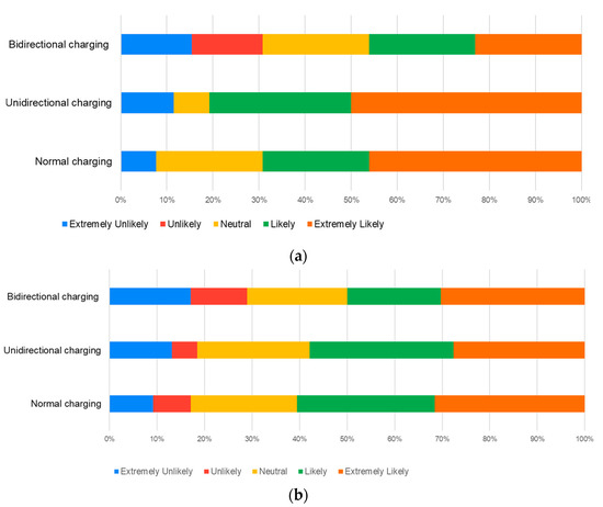 Comparing the responses of the EV owners (Figure 13a) and those who do not own EV (Figure 13b), we see a cautious attitude of the former towards bidirectional charging compared to the latter, which is not consistent with the increased knowledge about V2G of those who have EVs. Of course, they could be intimidated by the full control given to the power grid for charging and discharging their vehicle. On the other hand, there is a greater willingness to use normal charging by EV owners compared to those who do not own an EV, which might reflect their daily experience with this charging strategy. It is noteworthy that both categories show similar rates of unwillingness to participate in bidirectional charging, which would be different if they were fully aware of the technology. Regarding unidirectional charging, more than 80% (both “extremely likely” and “likely”) of EV owners would choose this method, compared to less than 60% of non-EV owners. A possible explanation of the above is that drivers who do not own an EV cannot understand the benefit of offering peak-shaving services to the power grid [45].