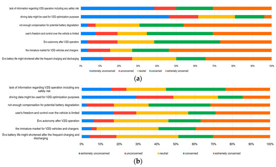 Participants’ concerns about the use of V2G: (a) EV owners’ response (question: how concerned are you about the following issues about the use of V2G?); and (b) non-EV owners’ response (question: how concerned are you about the following issues about the use of V2G?).