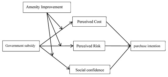 Stimulated by government subsidies, the supporting facilities for new energy vehicles are constantly improving, and the public’s understanding and trust are also increasing, further influencing consumers’ social perception and enhancing social confidence in sustainable development and the development of the new energy vehicle industry [61]. Under the influence of supporting facilities related to new energy vehicles, government subsidies have a stronger individual and social impact on consumers, positively regulating the relationship between government subsidies and perceived costs, perceived risks, and social confidence and increasing consumers’ willingness to purchase. Based on this, this article proposes the following hypotheses: