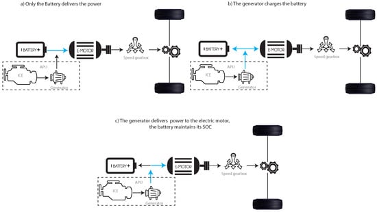 Figure 2 illustrates the three modes of operation: (a) discharge mode, where only the battery supplies power; (b) charge mode, where the generator recharges the battery; and (c) stable mode, where the generator powers the electric motor while the battery maintains its SOC.