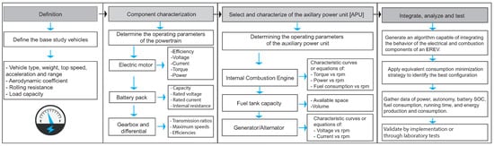 The auxiliary power unit (APU) is optimized for maximum energy efficiency, employing strategies to minimize fuel consumption and reduce emissions from the combustion engine driving the generator. The energy generated for battery charging is thoroughly analyzed using simulations in MATLAB-Simulink R2024a, and the obtained data are validated for accuracy. Furthermore, we propose a model to size a powertrain for Extended-Range Electric Vehicles, harnessing the high efficiency of the electric motor for wheel propulsion and the APU capabilities to charge batteries, thereby increasing the vehicle’s autonomy with minimal fuel consumption and emissions. These steps successfully fulfill the objectives of this research; see Figure 3.
