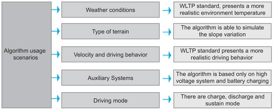 When simulating the range of an Extended-Range Electric Vehicle, there are several variables that can influence its performance. In the following concept map, different scenarios are analyzed, where the real part is considered at the moment of performing cycles in real conditions, or in some cases, predefined cycles to analyze specific consumption, depending on the variables that are taken into account. It is necessary to consider an acceptable range of these variables because although tests are performed in defined routes, many times, these vary even if they are controlled, for example, traffic, road environment [58], weather conditions [59], ambient temperature, the use of auxiliary systems, driving modes [60]. These scenarios can vary and have to be considered when performing these tests, unlike if they are performed at the laboratory level where the tests are more controlled but certain variables are neglected or certain assumptions are made. Figure 4 is a conceptual map showing all possible scenarios and their actual variations.