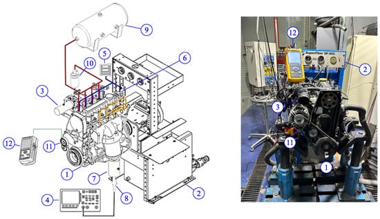 Experimental setup scheme (left) and picture (right). (1) Engine Z16SE, (2) engine dynamometer SUPERFLOW SF902, (3) air intake, (4) gas analyzer, (5) ECU, (6) ignition coil, (7) exhaust, (8) gas analysis probe, (9) fuel tank, (10) fuel pump, (11) generator/alternator, (12) Fluke 43b power analyzer. Yellow line: ignition current. Red line: fuel supply and measurement. Blue line: control. Green line: alternator current measurement.